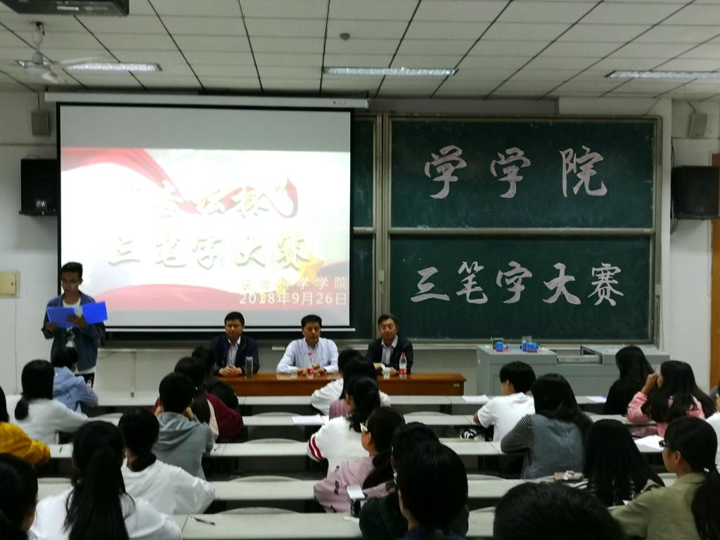 团委学生会于综合楼106教室举办师范生“杏坛杯”钢笔字、毛笔字、粉笔字“三笔字”决赛。党委副书记赵强以及张祥沛老师、郭永峰老师担任了本次比赛的评委。2016级、2017级师范生参加了此次比赛。