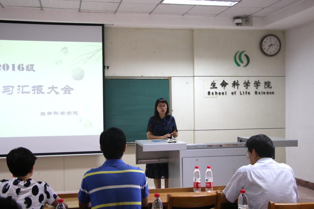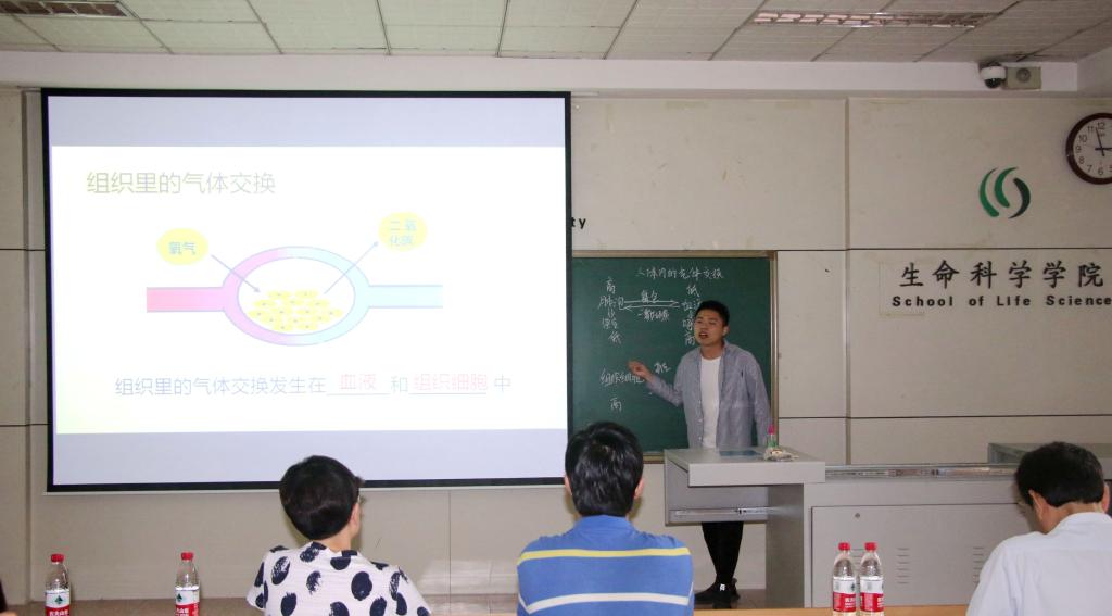 对指导老师们表示衷心感谢,同时也对实习结束的同学们表示祝贺。然后七位同学代表进行了实习汇报,同学们分为初中组和高中组进行汇报,主要讲授了呼吸作用、血型、物种等方面的内容,他们将课程内容与生活现象紧密结合,将知识与人类的身体机构相扣,让模拟课堂的气氛变得十分活跃。活动最后,张祥沛老师对七位同学的汇报从讲述内容、结合实际、感情表达、课件内容等方面进行了详细的评价,表示同学们通过实习学会了具体的讲课、制作教案的方式,并表示从教师基本素养角度看,同学们已经基本具有了作为老师要拥有的较大感染力和亲和力。讲话最后,张祥沛老师对同学们表达了美好的祝愿。