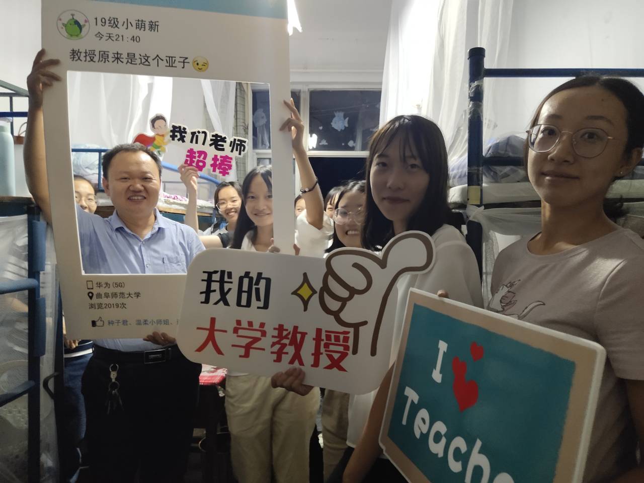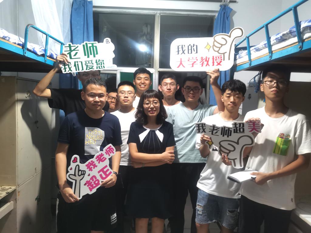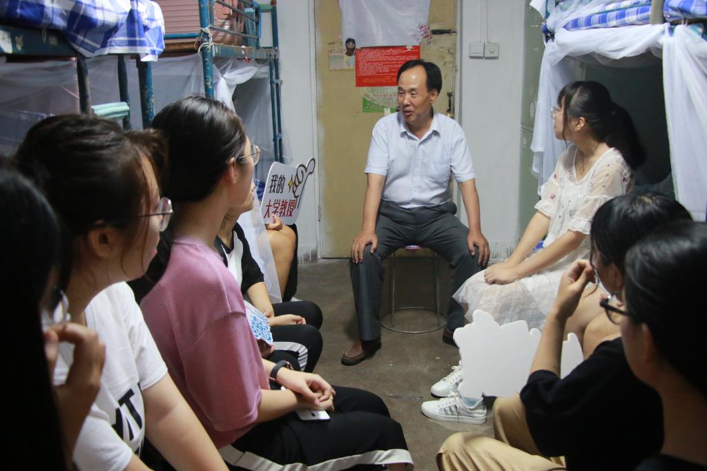 的新生宿舍里气氛热闹,欢快温馨,首次“我的大学教授”宿舍第一课活动正在热烈开展。包颖教授、候元同教授、王仁君教授、邱念伟教授走进新生宿舍,走访慰问2019级新生。