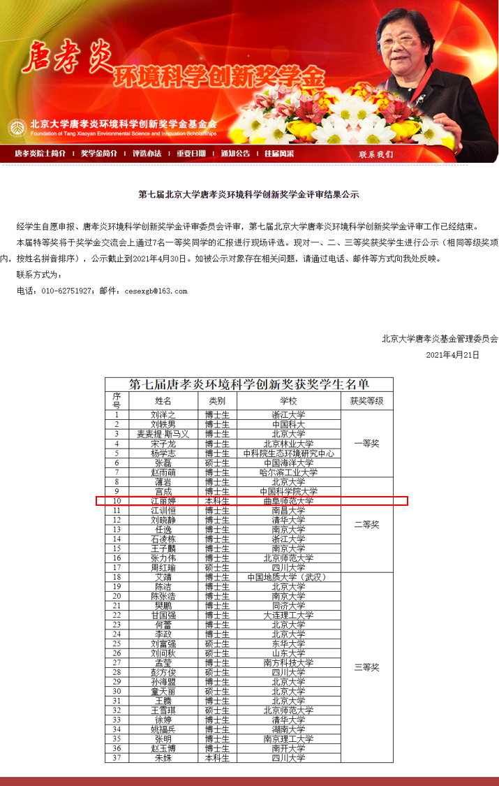 2021年4月21日,第七届北京大学唐孝炎环境科学创新奖学金评审结果出炉。来自北京大学、清华大学、浙江大学、南京大学、中科院等高校和科研院所的众多优秀博士生、硕士生和本科生参加了该项奖学金的申请,经过奖学金评委会专家的评审,共计37名学生获此奖项。探花视频