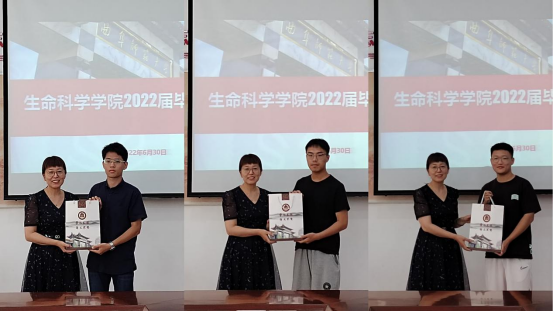 王仁君为参会的毕业生代表赠送毕业纪念礼物并合影留念。