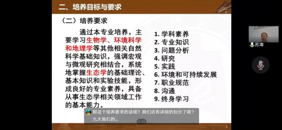 苏涛老师对生态学专业培养方案进行了解读,围绕培养目标与要求、学制与学分、学分分配、课程体系等主要内容,对新生开展专业教育。在苏老师的耐心讲解下,同学们对专业建设和课程目标有了更清晰的认识。