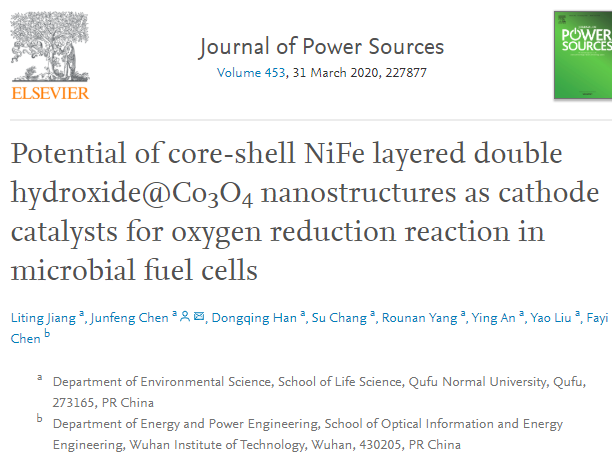2017级环境科学班江丽婷,韩冬青,常素,杨若楠,安莹,刘瑶的研究论文(Liting Jiang, Junfeng Chen*, Dongqing Han, Su Chang, Ruonan Yang, Ying An, Yao Liu, Fayi Chen. Potential of core-shell NiFe layered double hydroxide@Co3O4 nanostructures as cathode catalysts for oxygen reduction reaction in microbial fuel cells. Journal of Power Sources, 453(2020)227877.)。该论文以探花视频