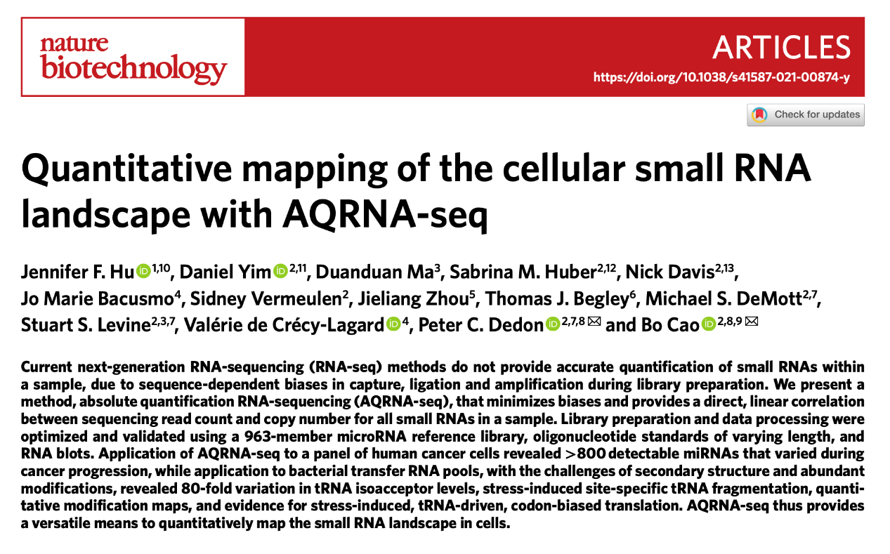 曹博教授团队在RNA遗传调控研究方向取得突破性进展,在国际著名期刊《Nature Biotechnology》发表了题为“Quantitative mapping of the cellular small RNA landscape with AQRNA-seq”的研究性论文。该项成果中研发的AQRNA-seq(Absolute Quantification RNA-seq)技术,首次实现了全局性RNA分子绝对定量分析,该技术已经获得授权国际PCT、美国、欧洲和中国专利各一项,曹博均为第一发明人。研究论文由曹博与美国麻省理工学院,联合弗罗里达大学、纽约州立大学等单位合作完成,曹博教授为论文的主通讯作者,探花视频