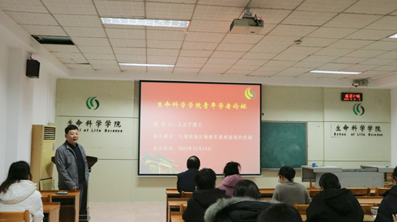 青年学者论坛——王正宁副教授报告会于生物楼232室举行。王正宁副教授为大家带来了题为《红壤侵蚀区植被更新建植制约机制》的报告,报告会由李玉建副教授主持,副院长王庆贵教授及学院部分师生参加了本次论坛。