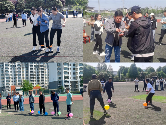 在整场比赛中,最精彩的项目当属气球爆爆爆,这个项目是个人与集体的融合,参与队员需要去踩破敌队的气球,同时要保护自己的气球,也要照顾到队友。随着比赛的进行,队员们不断转变策略,有的主动出击,有的坐山观虎斗,有的单打独斗,有的群起而攻,总之每队队员都用自己的方式保护自己的气球,争取最终的胜利。三人四足比赛中,队员们或相互搂着腰,或手挽着手,大声喊着“一二、一二”的口号,,你追我赶,奋力冲刺。有的队伍步调一致,一马当先。导师们也积极参与到各个项目中,与学生一起感受运动的快乐,操场上洋溢着师生欢快的笑声。