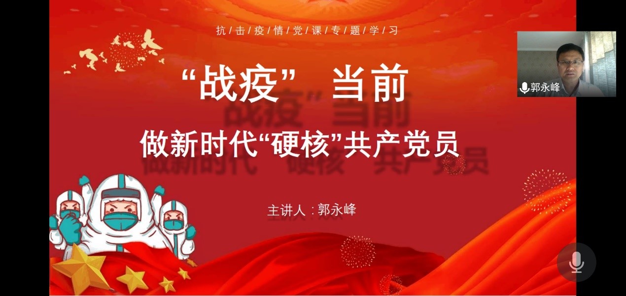 2020年7月8日下午,探花视频 教工党支部书记郭永峰为全体党员在腾讯会议上讲了题为“战疫当前,做新时代硬核共产党员”的党课。郭永峰围绕“透过战‘疫’的烽烟我们应当看到什么”、“对接战斗的过程我们应当做什么”、“直面未来的战场我们应该做什么”三个问题详细剖析了中国特色社会主义制度的优越性以及新时代共产党员的职责,切实提高了支部全体党员的“四个意识”、有效增强了“四个自信”。教工党支部全体成员参加了活动。