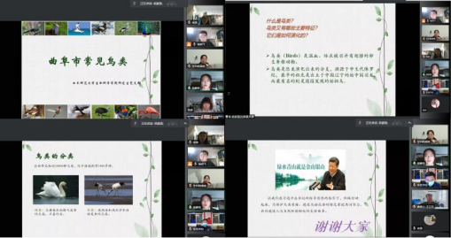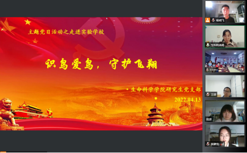 为贯彻党中央“为群众办实事”的号召,践行习近平总书记的生态文明建设理念,提高党员服务当地群众的意识,4月13日,学院研究生党支部结合师范院校特色和学科特点,开展了走进实验学校之“识鸟爱鸟,守护飞翔”的线上主题党日活动。曲阜市部分初中生物学教师、实验学校部分中学生、学院研究生党支部全体党员、部分入党积极分子参与了此次活动。活动由研究生党支部书记燕艳主持,共包含四项内容。