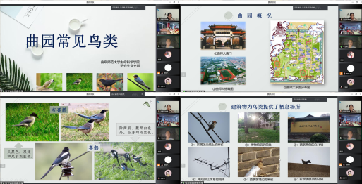 研究生马玉娇生动有趣的讲解了曲园生态环境、曲园常见鸟类两部分内容。她图文并茂的介绍了曲园绿树成荫、生态环境优美,为鸟类提供了适宜的生存环境,并结合视频详细的向大家介绍了曲园中的家雀、珠颈斑鸠、白头鹎、戴胜、啄木鸟、银喉长尾山雀等可爱的精灵们。她提到,曲园师生爱鸟护鸟,为鸟儿创设了更加自然的栖息场所,并呼吁中学生们关注鸟类、保护自然。