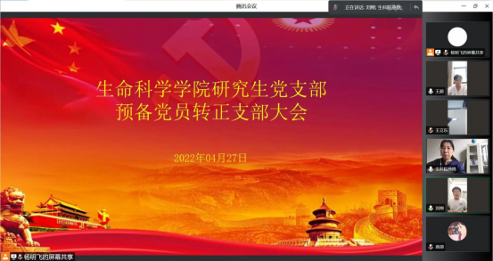 研究生党支部于2022年4月27日下午召开线上支部大会讨论预备党员转正的问题。会议由党支部书记燕艳主持,全体研究生党员参加。