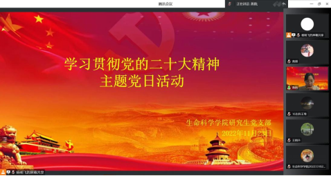 研究生党支部于2022年11月23日20点,开展了线上集中学习党的二十大精神的主题党日活动。本次活动由研究生党支部书记燕艳主持,全体研究生党员参加。