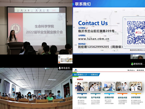 2022届毕业生就业推介会暨书记院长“访十企”活动通过腾讯视频会议召开。学院党委书记李志广、院长王仁君、党委副书记张明洁、团委书记刘文静、学院本科毕业生、研究生毕业生在生物楼3个分会场参加了线下会议,10家用人单位通过腾讯会议线上参加了此次活动,化学与化工学院部分毕业生也积极参与了本次会议。会议由学院团委书记、就业辅导员刘文静主持。