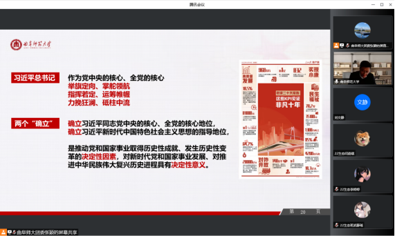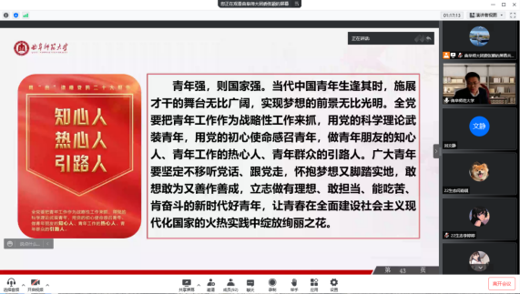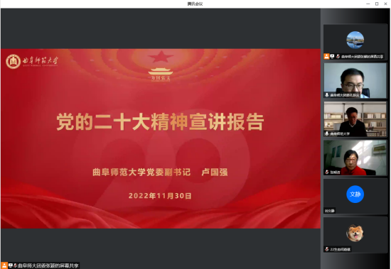 根据省委教育工委有关要求和学校领导干部讲思政课的相关安排,11月30日下午,学校党委副书记卢国强通过腾讯会议为联系班级2022级生物科学一班全体学生作党的二十大精神宣讲报告,与青年学子互动交流,提出希望和要求。报告由校团委书记孔轶众主持,探花视频