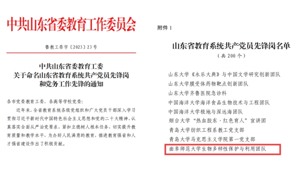 生物多样性保护与利用团队获评“山东省教育系统共产党员先锋岗”。