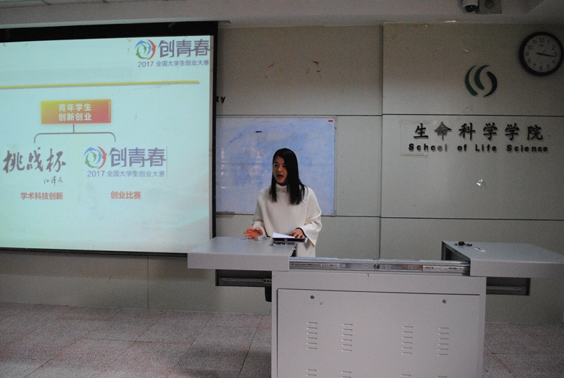 在生物楼二楼多媒体教室举办了“创青春”经验交流会。“创青春”全国大学生创业大赛是团中央重点打造的一项赛事,每两年举行一届,下设“挑战杯”大学生创业计划竞赛、创业实践挑战赛、公益创业赛3项主体赛事。