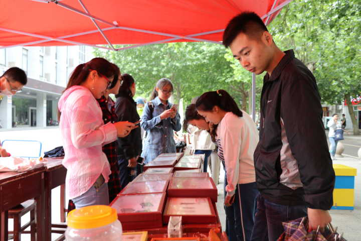 一大早,工作人员就摆放好了展示用品,新颖的活动形式吸引了不少同学和附近居民前来参与。工作人员仔细为大家讲解着我们身边昆虫的种类、昆虫种类的多样性以及昆虫与人类的关系,并引导大家观看了昆虫的标本。