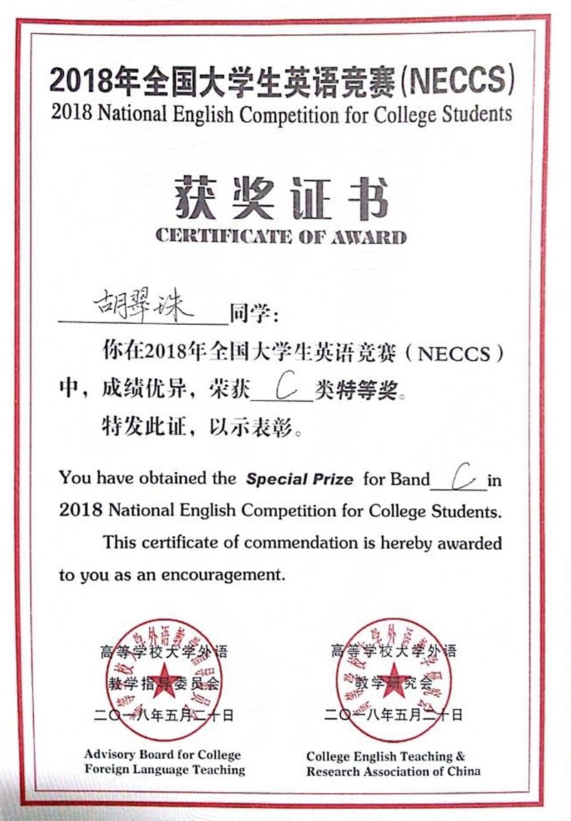 胡翠珠在2018年全国大学生英语竞赛中喜获特等奖