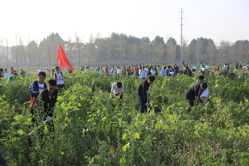 活动从早晨6点开始,参与活动的所有成员按照要求在规定时间到达指定地点。整齐的队伍显示出生科学子昂扬向上的精神风貌,面对杂草丛生的场地,同学们不但没有退缩,反而表现出了高昂的热情。所有人被分为八个小组,在老师的带领下,认真积极的参与除草活动。活动开始前,老师向同学们教授了除草工具的使用方法,并再三叮嘱同学注意安全,还细心的为同学们准备了防蚊虫叮咬剂。老师们以身作则,同学们奋勇争先,少许时间便清理出一大片空地。学生们还借此机会认真的向老师请教关于植物学的各种专业知识,和老师探讨大学生活中的各种感悟体会,现场气氛融洽而热烈。尽管顶着炎炎烈日,但同学们的脸上都洋溢着劳动后的快乐与满足。