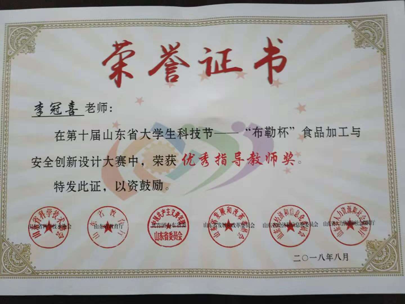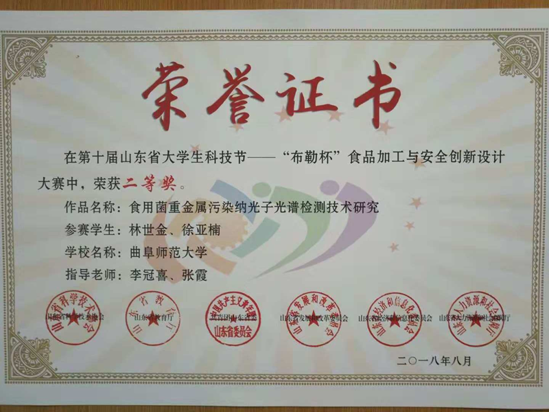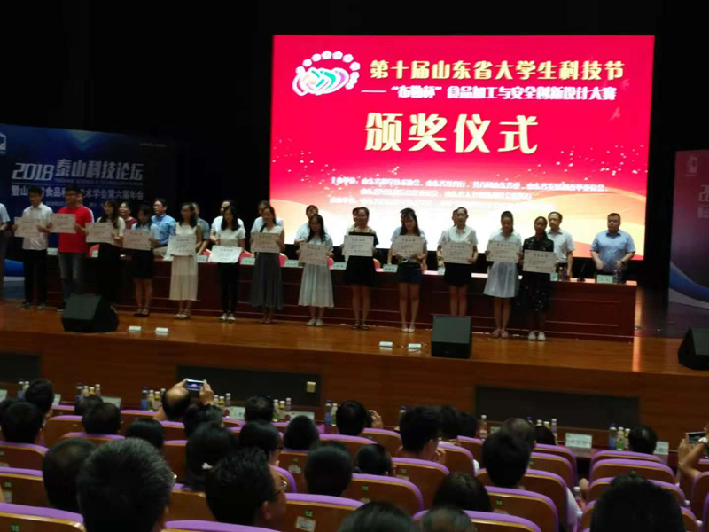 在山东省食品科学技术学会第六届年会上,探花视频 食品质量与安全专业学生徐亚楠、林世金荣获第十届山东省大学生科技节--“布勒杯”食品加工与安全创新设计大赛二等奖。两位同学经过初赛、复赛和决赛,过五关六将,获得了较好的比赛成绩,展现了探花视频 食品专业学子过硬的专业素养和积极的创新意识,也展示了探花视频 食品专业这一品牌的综合实力和巨大发展潜力。另外,在本次比赛中,李冠喜老师获得优秀指导教师奖。
