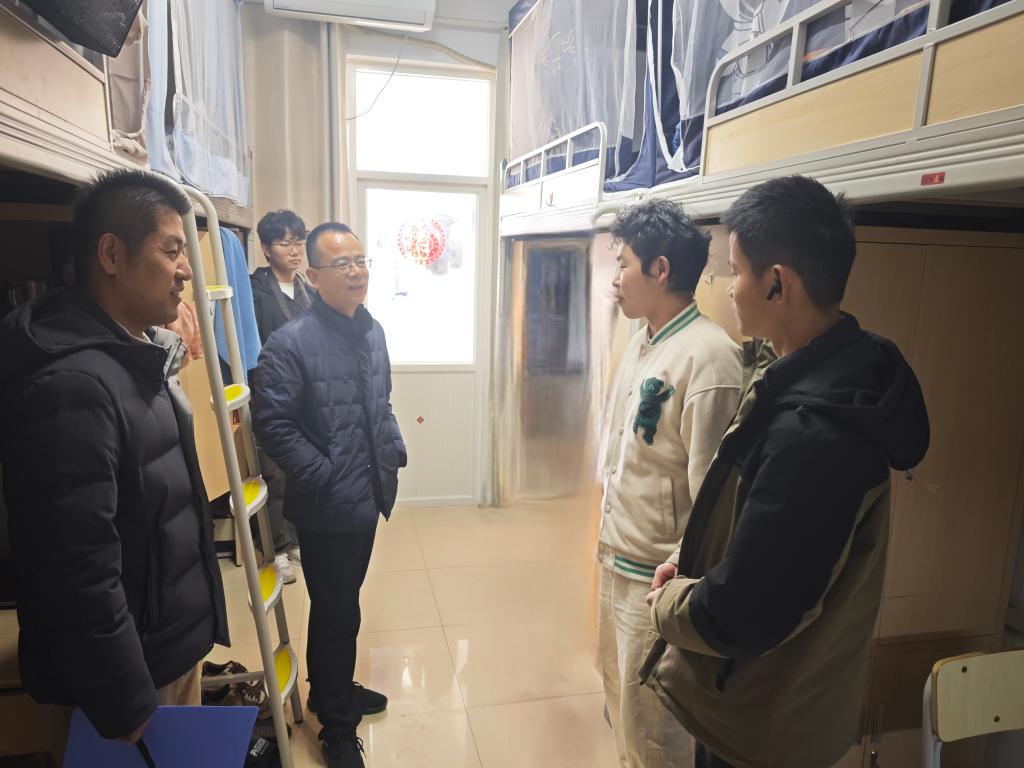 在学生宿舍,与同学们亲切交谈,叮嘱大家保持良好作息,讲卫生、重安全,营造温馨和谐的宿舍氛围。