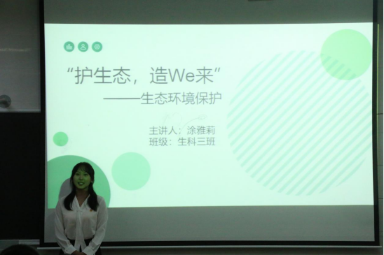 “护生态,造We来”生态文明小讲堂活动在生物楼218教室顺利举办,本次活动面向2022级、2023级、2024级全体学生,并由学生会副主席,办公室、宣传部、媒体部、卫生与宿管部部长担任评委。