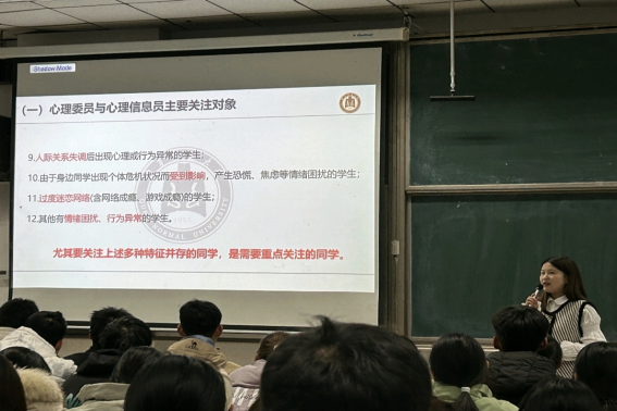 心理委员及心理信息员培训会于综合楼101教室顺利举办。本次会议由学院心理辅导员袁晓涵老师主持,全体心理委员及心理信息员参加了本次会议。