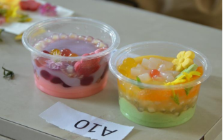 活动以“知识问答”环节暖场开幕,主持人与参赛选手积极互动,营造了愉悦轻松的气氛。随后,主持人上详细介绍了果冻制作的原理、过程及技术要点。比赛开始后,各小组同学团结协作,发挥想象力,创造出了一款款独具匠心、色香味俱全的果冻作品。