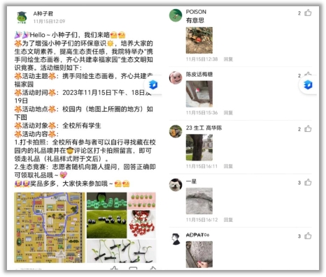 本次活动面向2021级、2022级、2023级全体同学,活动以两种方式进行,活动参与者可以选择寻找藏在校园内的礼品并打卡拍照,即可领走礼品。或者选择生态文明知识竞答,由志愿者随机向参与者提问,题目分为填空题、选择题和判断题三种形式。探花视频
