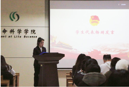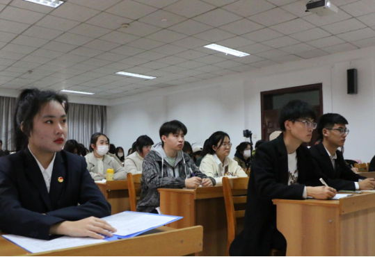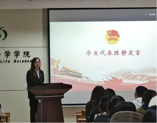 学院团委组织部副部长杨羽、党建学生工作部副部长陈静作为学生代表分别进行交流发言,分享学习心得。杨羽从学习党的二十大精神、领会党的二十大的重大意义两个方面进行了交流分享,强调了中国青年坚定不移听党话、跟党走的必要性,并号召大家作为肩负人民期待和时代重任的青年,应主动将个人理想行动融汇在党和人民的伟大事业中,以理论武装筑牢信仰根基,坚定为理想实施奋斗的信念。陈静从在十年伟大变革中汲取精神力量、投入中国式现代化伟大事业、争当担当民族复兴重任的新时代好青年三个方面分享了心得感悟,表达了自己作为青年一代,争做走在时代前列的奋进者、开拓者、奉献者的决心。