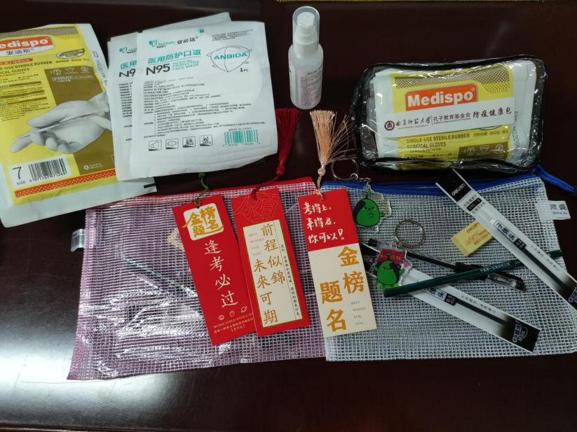 这份考研“加油包”里包含限定款种子君定制祝福钥匙扣、祈福书签和考试所需文具。钥匙扣和书签上用心地写着“金榜题名”“未来可期”等励志寄语,给同学们鼓劲打气、加油助威。希望同学们健康平安,考出好成绩。
