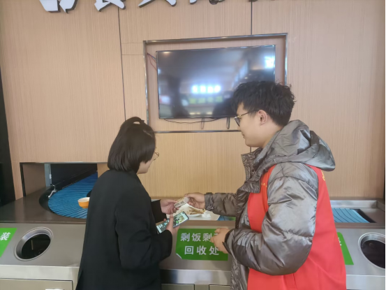 图为志愿者向践行“光盘行动”同学发放奖品