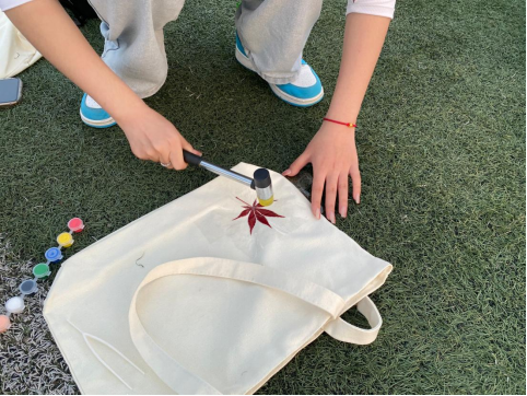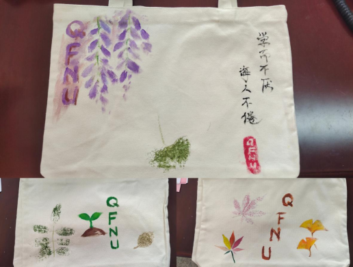 活动伊始,徐梦萱向大家介绍植物采集的注意事项以及植物拓印的相关知识、操作步骤等。听完讲解后,同学们挑选自己喜欢的树叶和花朵作为表现元素,利用捶打等方式将植物形状以及纹理拓印在布料上,从植物的根、茎、叶、花、皮等部位萃取出色彩。以布为纸,以叶作画,拓印让易逝的花草变为永恒,将平凡的帆布袋变成了一件件艺术品,绘制一幅幅独属于“春天”的浪漫画卷。制作结束后,大家纷纷表示要将布袋利用起来,减少白色塑料污染,同学们还将优秀帆布袋作品选出送给学院老师留作纪念,赢得老师的称赞。