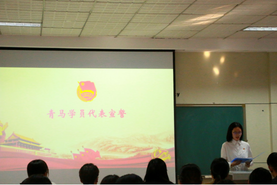 团委副书记刘蓉作为学生干部代表进行发言,我们要牢记重托、不负历史使命,在学习中进步,在实践中成长,在奉献中升华是对‘青年马克思主义者’的深度诠释,更是我们作为新时代学生骨干所肩负的不可推卸的责任。
