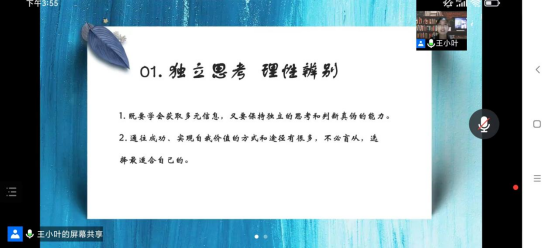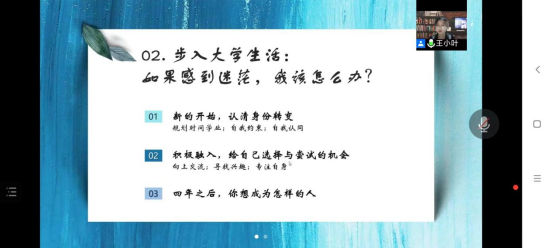 王小叶结合自身成长经历,引导新生学会独立思考,选择最适合自己的方式和途径实现自我价值,度过有意义的大学四年。她鼓励大一新生认清身份的转变、学习方式的变化,积极融入大学生活。树立远大目标,合理规划时间,通过每一阶段的努力让自己成为优秀的人。