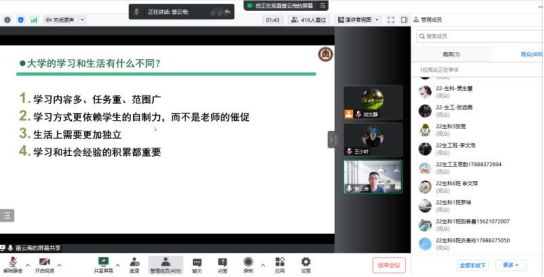 优秀教师队伍的了解,有效地缓解了新生们的开学焦虑。结合自己所在宿舍同学全员考研上岸的经验,向师弟师妹们分享了维持和谐宿舍人际关系的技巧,说明良好宿舍人际关系的重要性。他激励新生同学们,要主动走出舒适圈,多做尝试,树立终身学习的理念,注重学习和社会经验的积累,引发了同学们的思考。