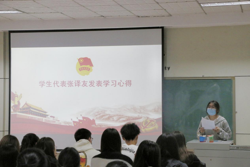第九次党代会工作报告的主要内容,展望了新发展阶段的历史使命、奋斗目标和主要任务。随后由学生代表张译友发表学习心得,分享了自己对大会精神的认识和理解。