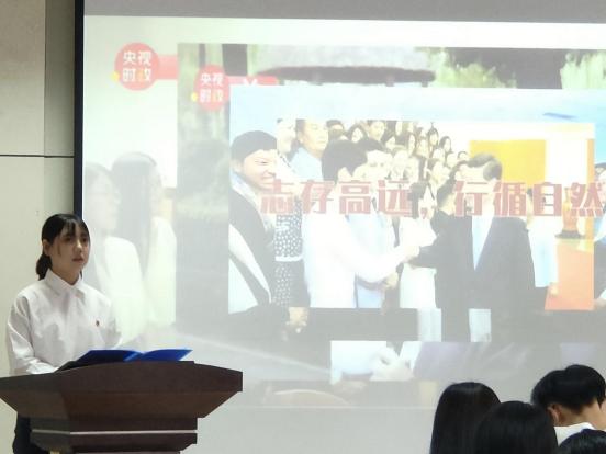 本次学习交流会在铿锵有力的国歌声中拉开帷幕。随后,同学们共同观看了《习近平与大学生朋友们》时政微纪录,纪录片讲述了习近平总书记与青年学生交流的点点滴滴。习近平总书记对青年学生们寄予厚望:“愿青年们牢记党的教诲,不负时代、不负韶华、不负人民,在青春的赛道上奋力奔跑,跑出这代人最好的成绩。”观看完视频后,感动之余,同学们对自己身上所肩负的责任与使命有了更加清晰的认识。最后,学生代表陈炳兆、赵一冉分享了他们的学习心得。他们提到,经过学习后,习近平总书记亲和、诚挚、处处为人民着想的形象在他们心中更加生动,他们也更加坚定了把青春与祖国的前途和命运紧密相连的决心。