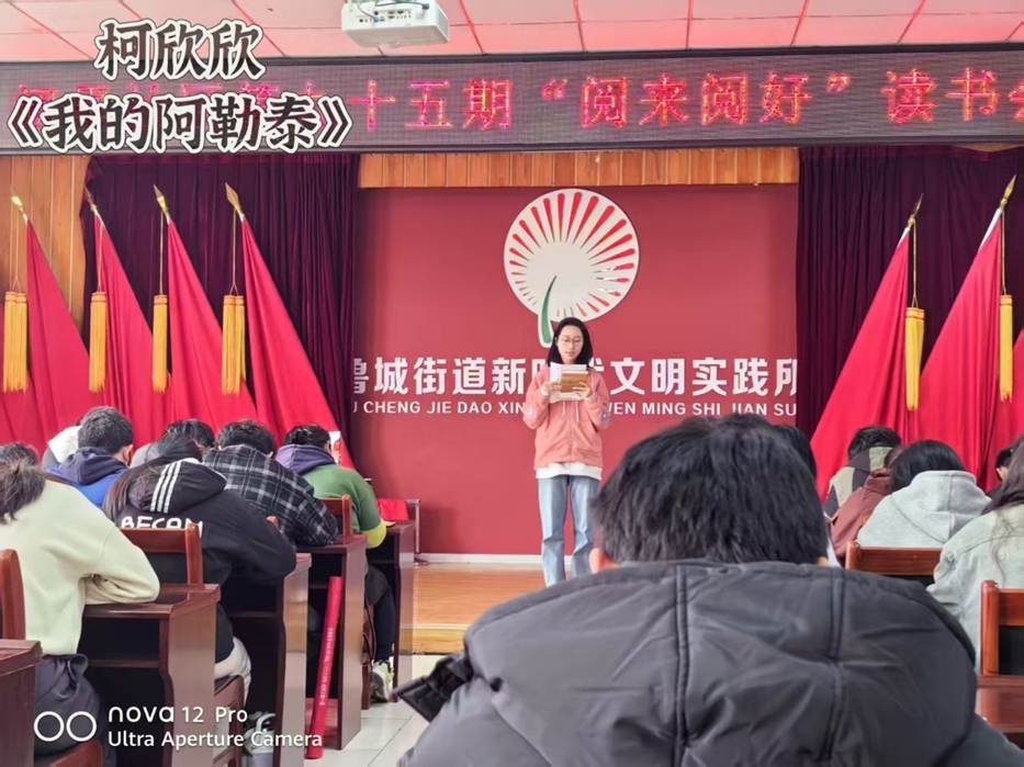 活动伊始,志愿者们通过精心设计的破冰环节,以"最打动我的一本书"为话题开启对话,迅速拉近与社区居民的情感距离。在核心分享环节,志愿者团队创新采用"1+1"模式(1本经典书籍+1个生活议题),通过《山月记》探讨自我认知的困境与突破,借《沉思录》解析现代生活的哲学智慧,用《活着》引发对生命韧性的思考。其中,志愿者曹佳乐分享《被讨厌的勇气》时,巧妙结合社区人际关系实例,引得在场居民频频点头;柯欣欣朗诵《我的阿勒泰》选段时,声情并茂的演绎让书香浸润整个活动空间。