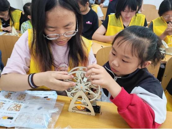 在制作摩天轮模型时,大学生志愿者耐心地向小学生们讲解着每一个步骤,从搭建底座到安装座舱,孩子们眼中闪烁着好奇与兴奋的光芒。他们用稚嫩的小手,仔细地粘贴、拼接,将一个个零件组合成精美的摩天轮。当看到自己亲手制作的摩天轮缓缓转动起来时,孩子们欢呼雀跃,脸上洋溢着自豪的笑容。