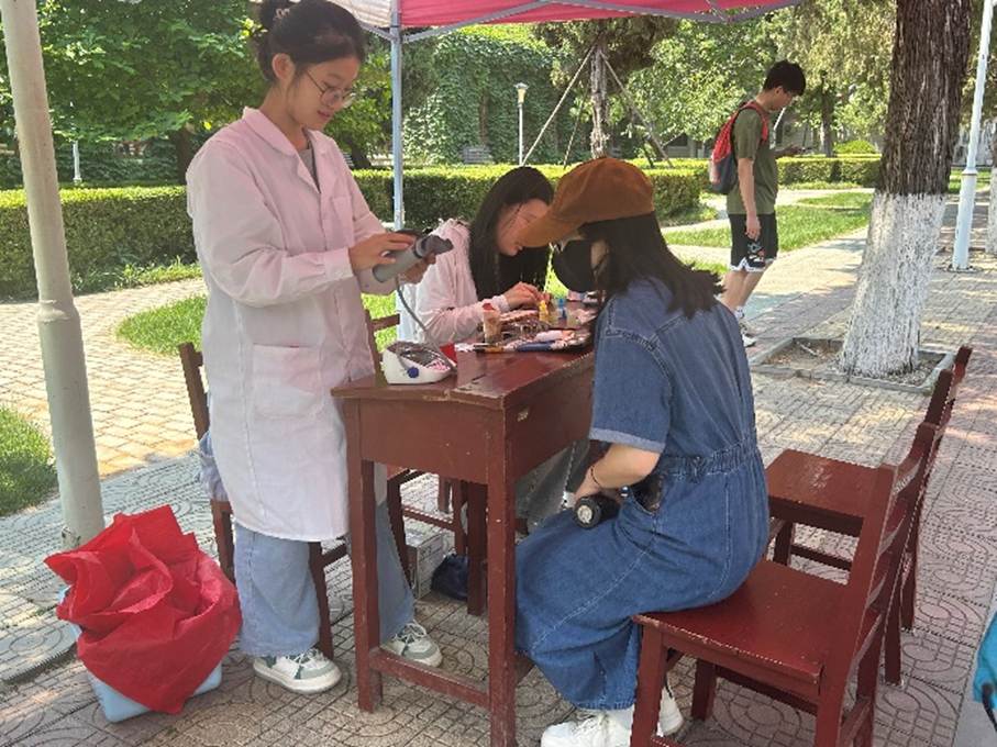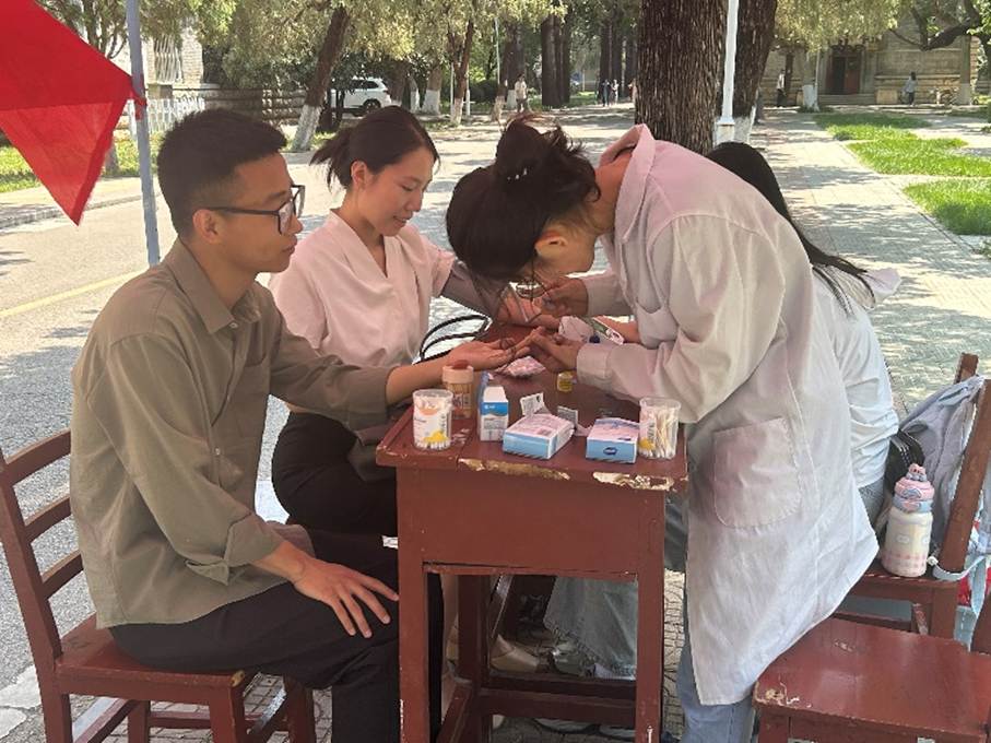 活动前期,工作人员接受了系统性的培训,培训内容包括血压测量的精准操作、血型检测的规范流程,以及健康知识的科普要点,以确保每位工作人员熟练地掌握操作过程。活动期间,工作人员身着白色实验服,为自愿参与的师生开展血压测量和血型检测服务,同时积极普及相关健康知识。