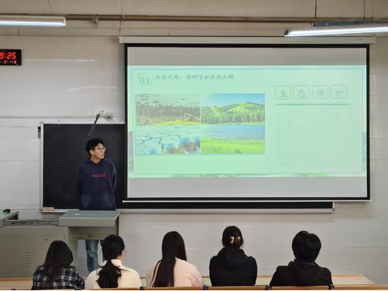 本次活动吸引了来自2023至2025三个年级的10名本科生积极参与,展开一场别开生面的线下讲课比赛。选手们围绕生态文明政策、生物多样性保护、环保实践等多个维度,以清晰的逻辑与生动的表达,深入剖析全球生态环境面临的挑战,并提出具有建设性的应对策略。他们巧妙融合专业理论知识与教学实践,从教学设计、课件制作到现场呈现,充分展现了扎实的专业功底和出色的综合素养。现场观众聆听认真,反响热烈。