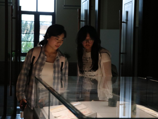 在讲解员引导下,新生们依次参观了“教育溯源”“师德典范”“教育变迁”等核心展区。他们在泛黄教案手稿前驻足,见证老一辈教师对知识点的精心打磨;透过展柜里的早期教具(民国算盘、80年代粉笔盒等)直观感受教育条件的变迁;教师事迹展板上“扎根山区四十年”“带病坚守讲台”等故事,令不少同学动容。讲解员结合展区内容,讲述陶行知先生的教育理念、于漪老师的语文教学艺术等案例,让新生们对“师德”二字有了更具象的理解。不少同学拿出笔记本记录触动自己的语句,现场氛围庄重而温暖。