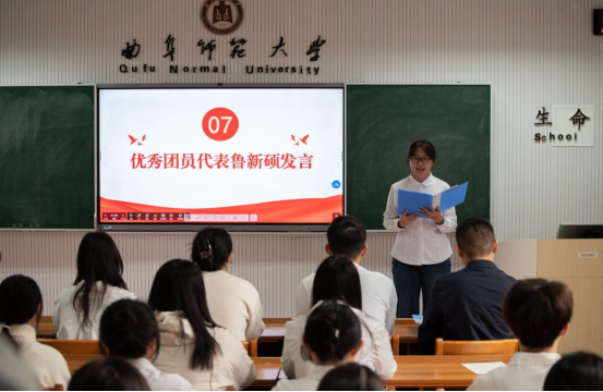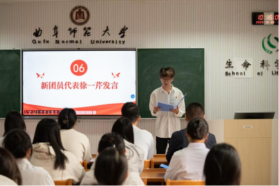 徐一芹同学代表新团员发言,表达了加入团组织的自豪与激动,承诺将以团员标准严格要求自己。优秀团员代表鲁新硕同学向新团员表示祝贺,并分享了对坚守初心、团结奋进的体会。