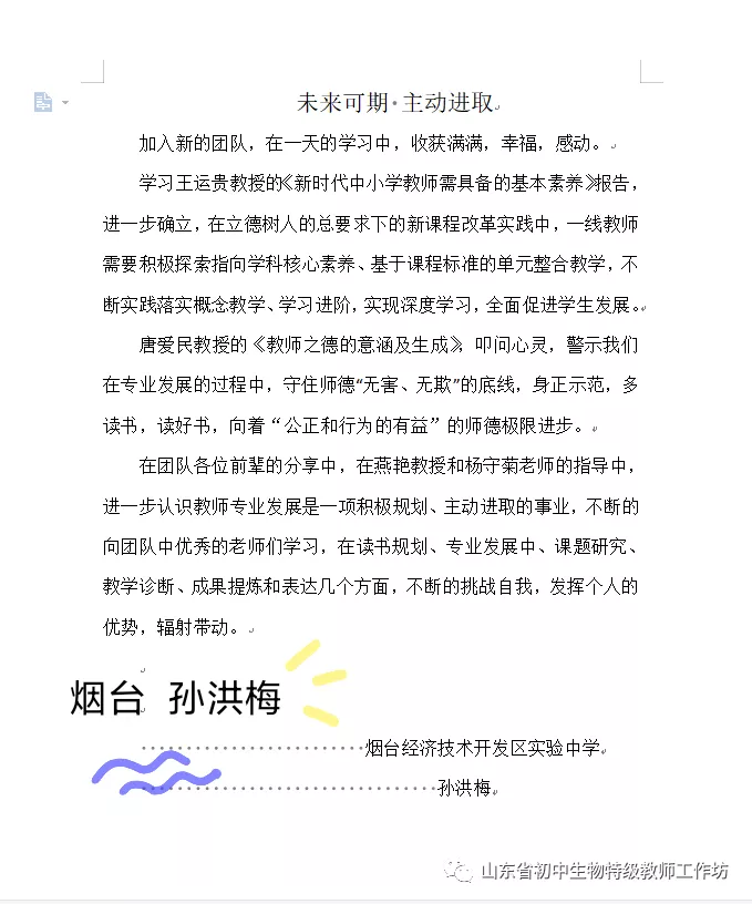 举行第一次研讨活动,研讨制定山东省初中生物学特级教师工作坊三年工作规划、工作机制、第一年度工作计划等。会议进行线上顺利、线下有序。来自省内各地区的教师们受益匪浅、感悟颇多,会议结束后纷纷表示意犹未尽并撰写了心得体会。