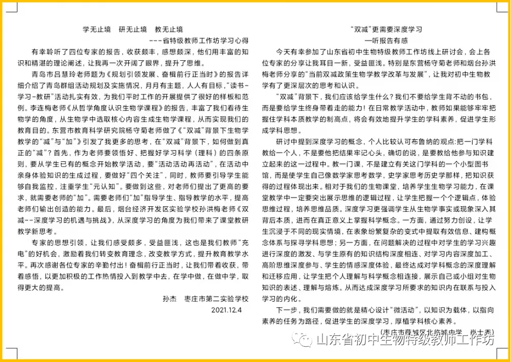 读万卷书不如行万里路,行万里路不如名师引路,为进一步提升教师专业化发展,2021年12月4日上午,山东省初中生物特级教师线上交流研讨会成功举办。山东省初中生物特级教师工作坊枣庄群组 主持人杨慧老师带领全体成员参加了本次活动,共享研讨盛宴。